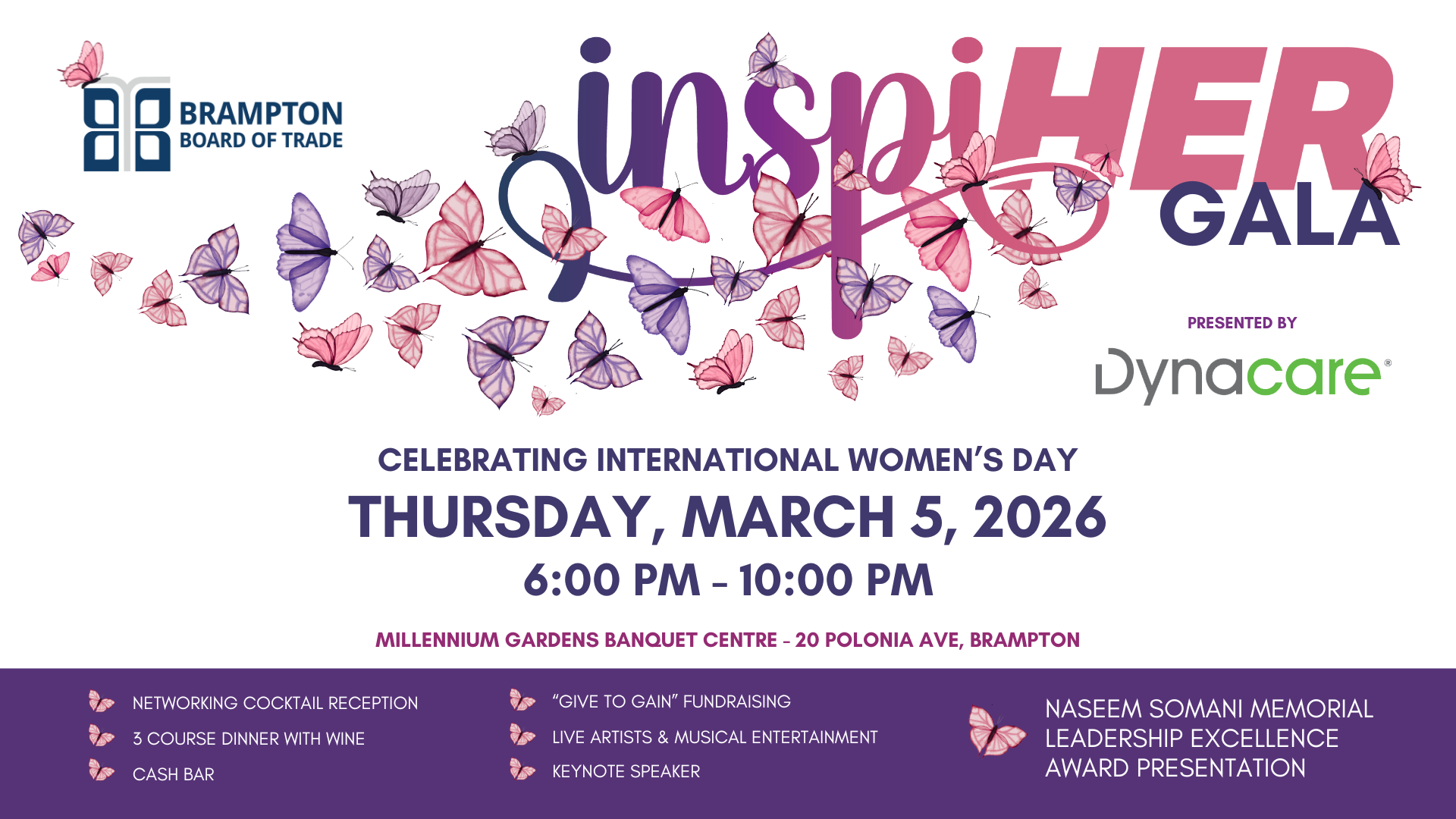 Join Brampton’s business and community leaders for the 2026 inspiHER Gala, a premier celebration honouring International Women’s Day and the remarkable achievements of women. This highly anticipated annual event brings together executives, entrepreneurs, changemakers, artists, and advocates to celebrate leadership, creativity, and progress toward gender equity.